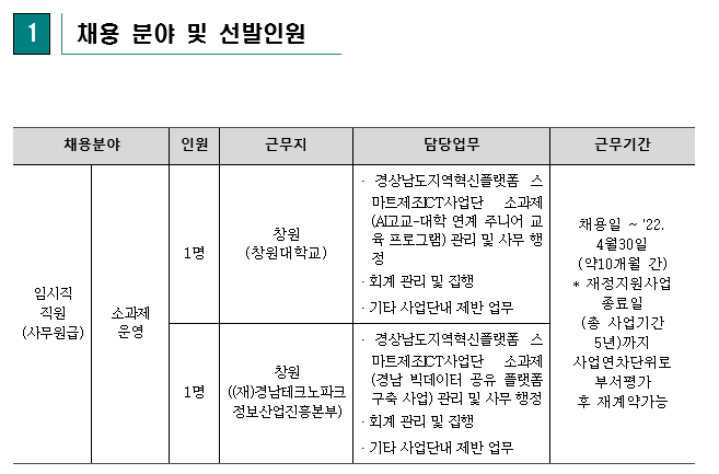 경남대학교 경상남도지역혁신플랫폼 스마트제조ICT사업단 행정지원팀 기간제 직원(임시직) 채용을 안내하오니 붙임 공고문을 참고하시어 접수기간 내에 접수 바랍니다.