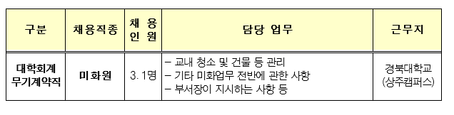 경북대학교(상주캠퍼스)에서 대학회계 계약직원을 다음과 같이 공개모집하오니 역량 있는 분들의 많은 지원 바랍니다.