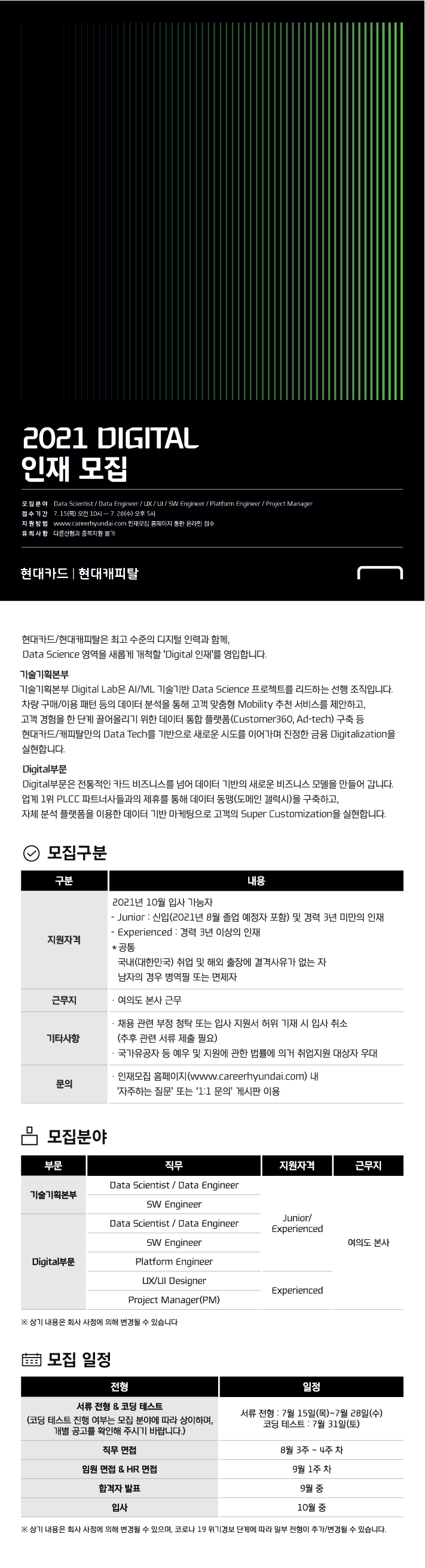 현대카드/현대캐피탈 2021 Digital 인재 모집 7월 28일까지