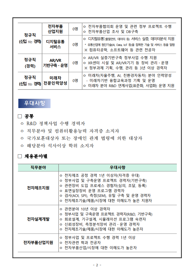 모집분야 : 전자분야제조-설계(생산) / 디지털 유통서비스, 데이터 분석 / AR-VR사업기획,장비관리 / 미래차 전문인력양성사업기획, 운영