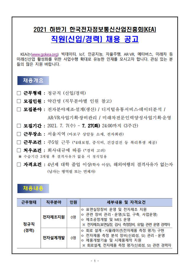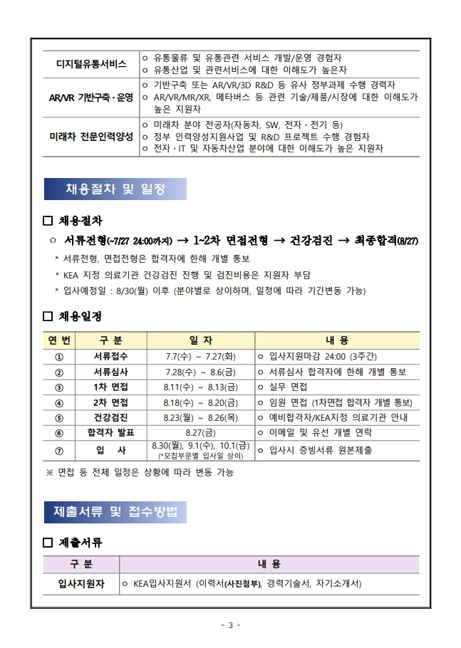 KEA 는 빅데이터, OIT, 인공지능, 자율주행, AR-VR, 메타버스, 미래차 등 미래신산업 활성화를 위한 사업수행 확대로 유능한 인재를 모시고자 합니다. 관신 있는 분들의 많은 지원 바랍니다.