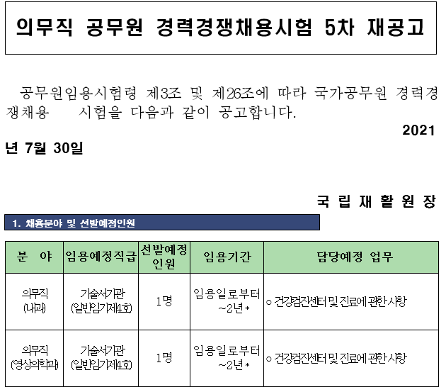 의무직 공무원 경력경쟁채용시험 5차 재공고