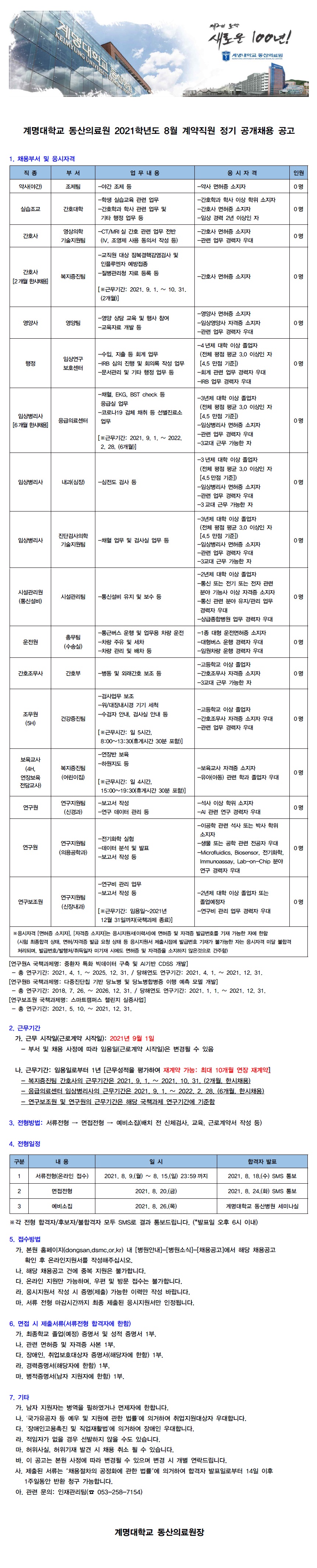계명대학교 동산의료원(달서구) 2021년 8월 계약직원 정기채용 공고 - 8월 15일까지
