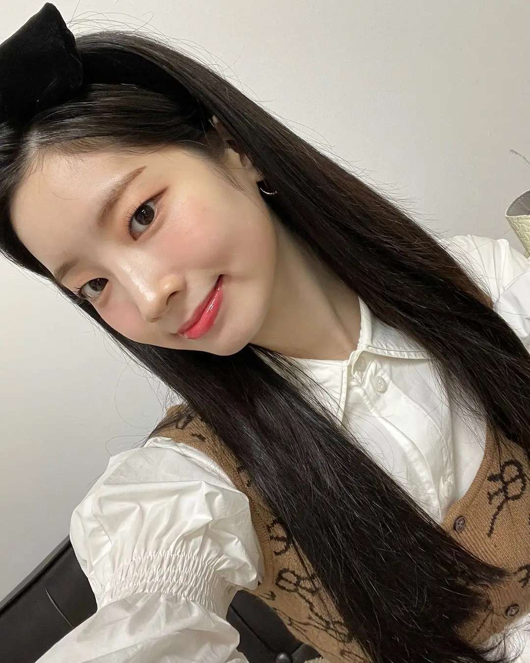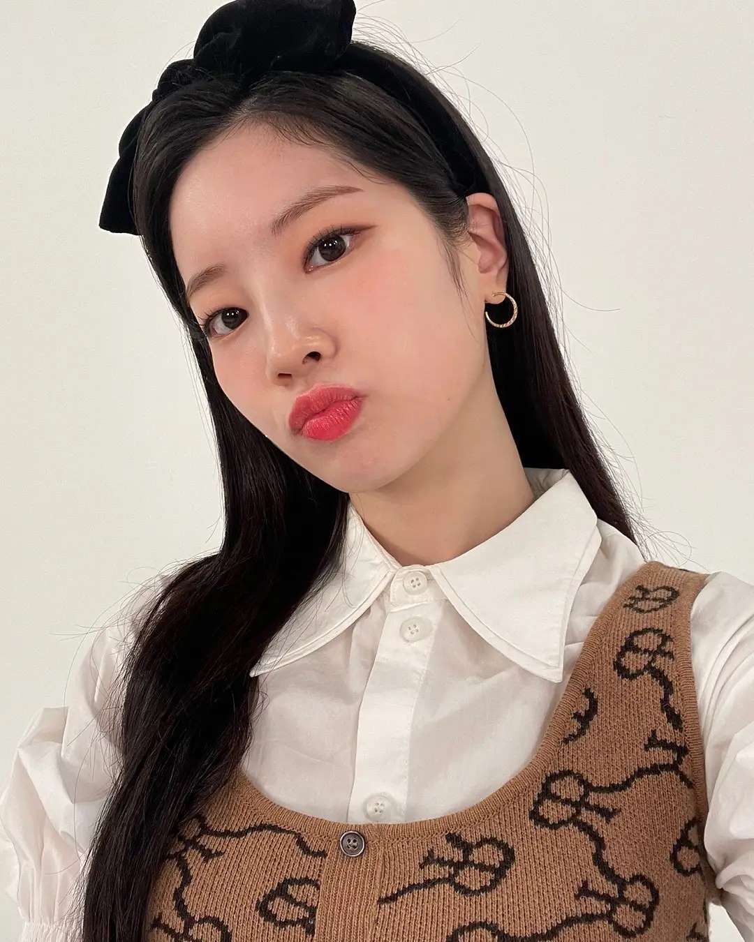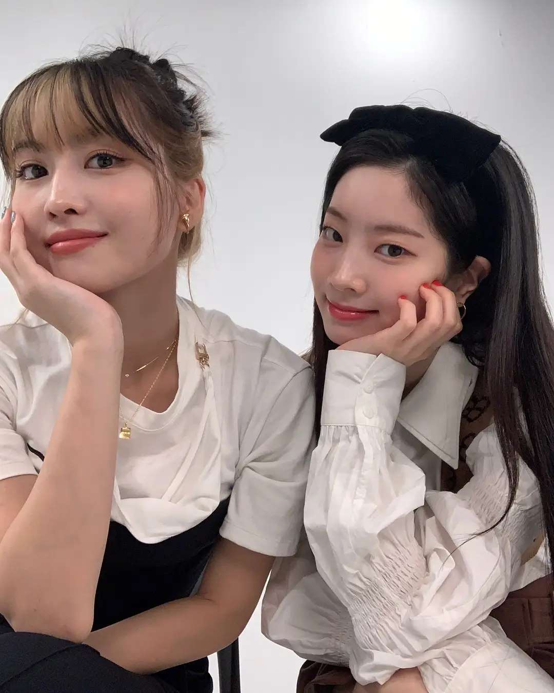 모모는 화이트 상의에 검은 원피스, 다현은 화이트 블라우스에 갈색 원피스를 입고 있다.