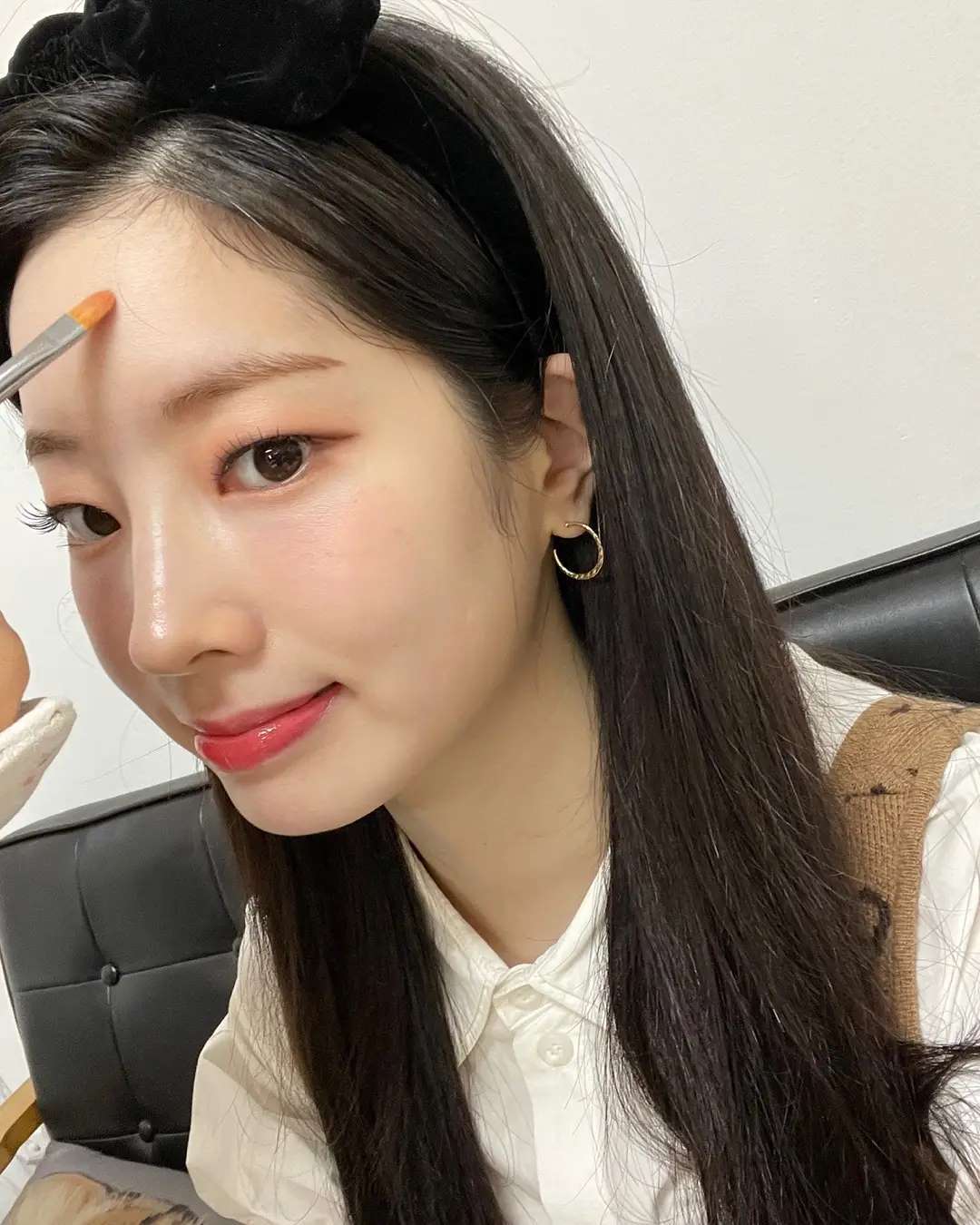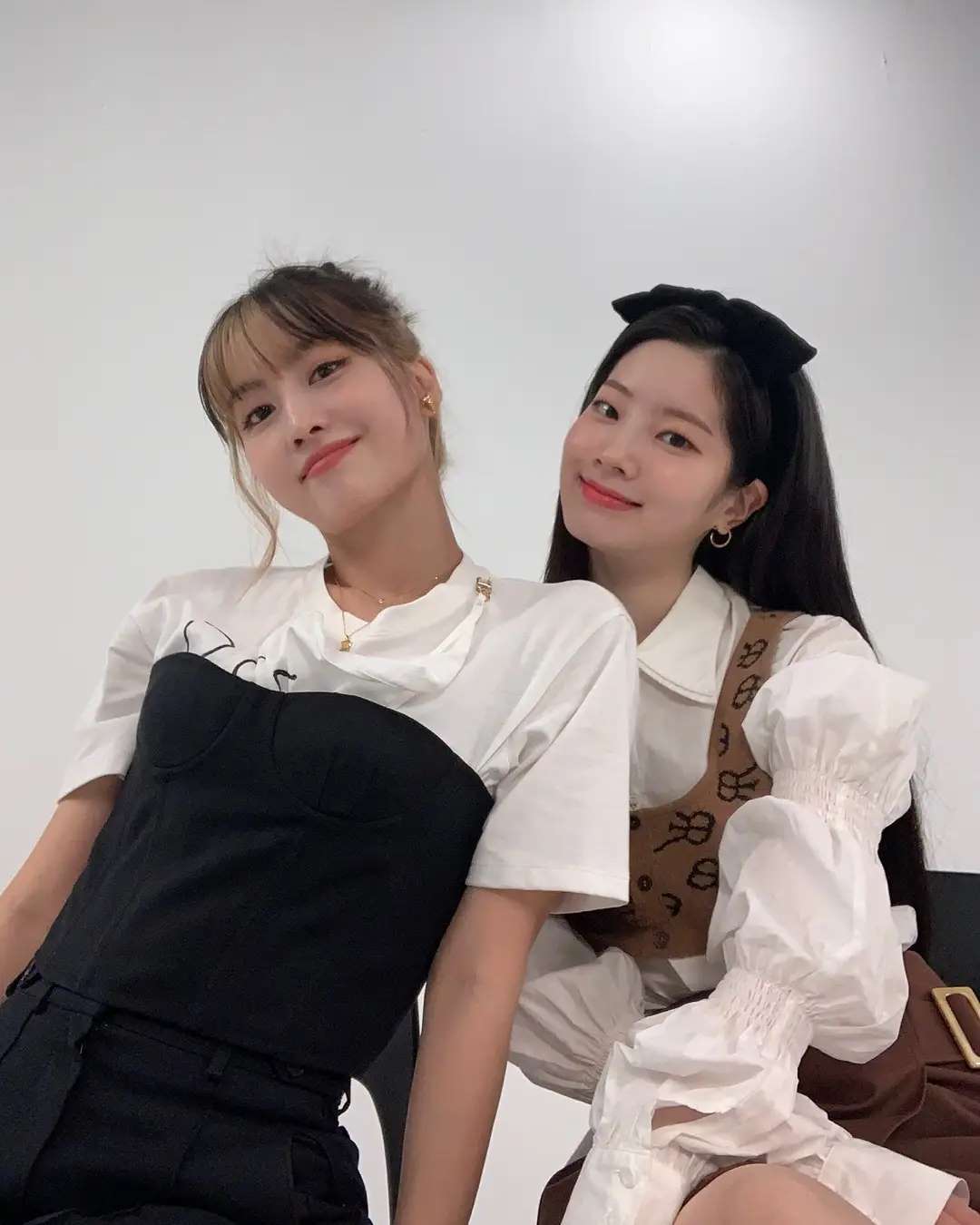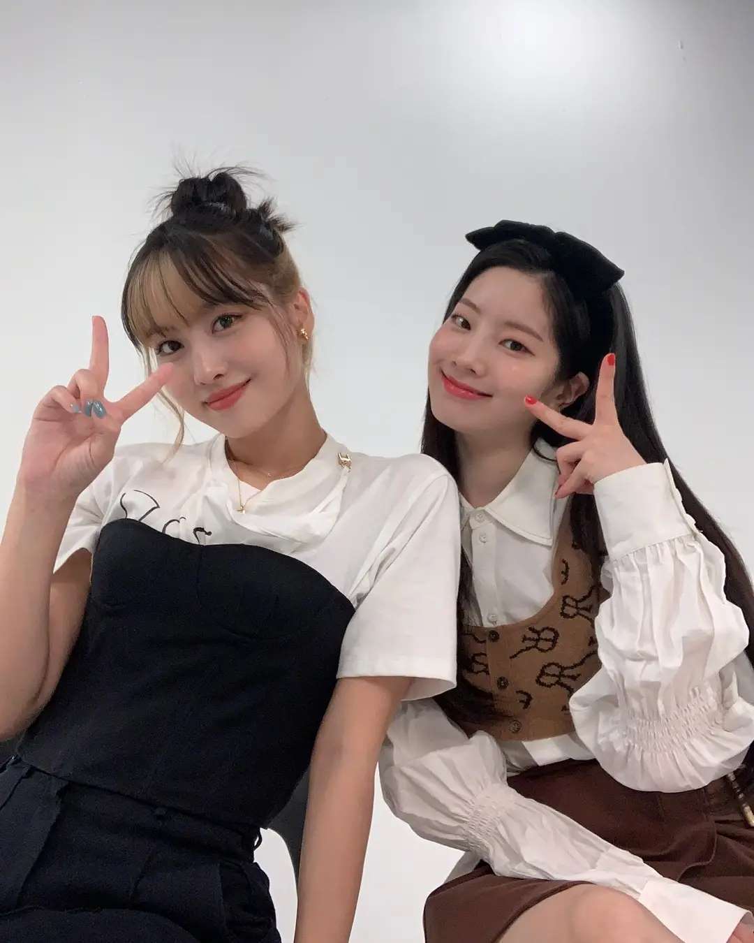 모모는 화이트 상의에 검은 원피스, 다현은 화이트 블라우스에 갈색 원피스를 입고 있다.