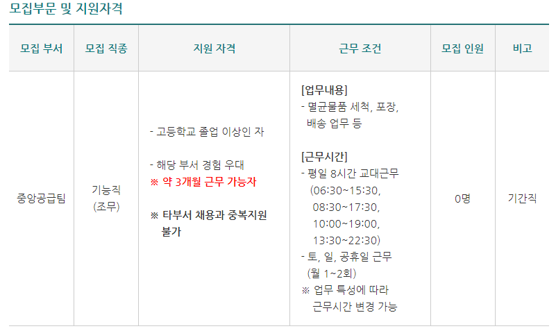 [업무내용] - 멸균물품 세척, 포장, 배송 업무 등 [근무시간]- 평일 8시간 교대근무 (06:30~15:30, 08:30~17:30, 10:00~19:00, 13:30~22:30) - 토, 일, 공휴일 근무 (월 1~2회) ※ 업무 특성에 따라 근무시간 변경 가능 |