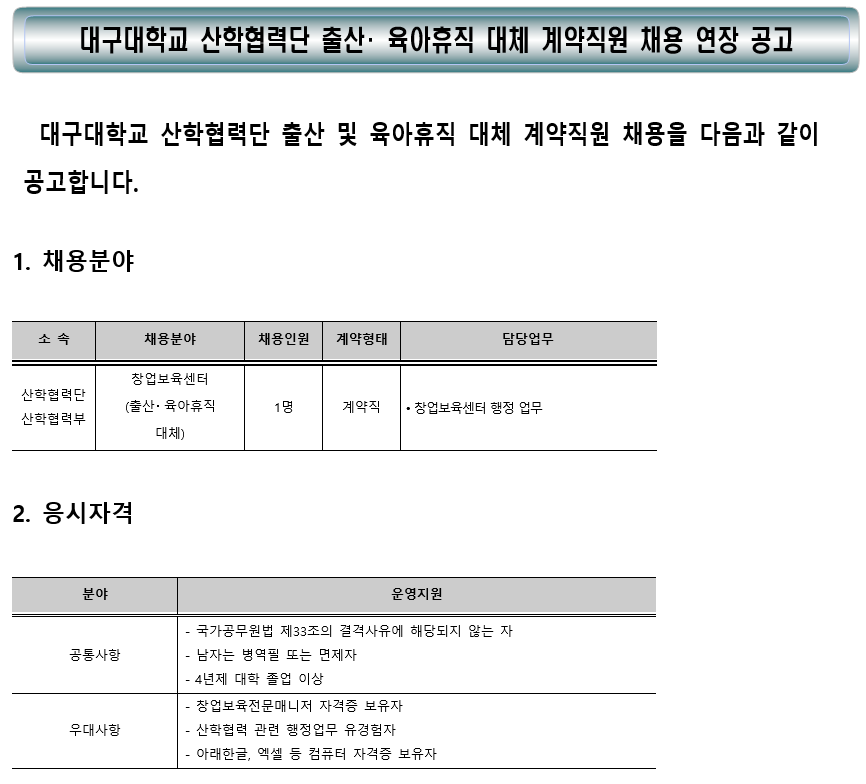 대구대학교 산학협력단 출산·육아휴직 대체 계약직원 채용 연장 공고