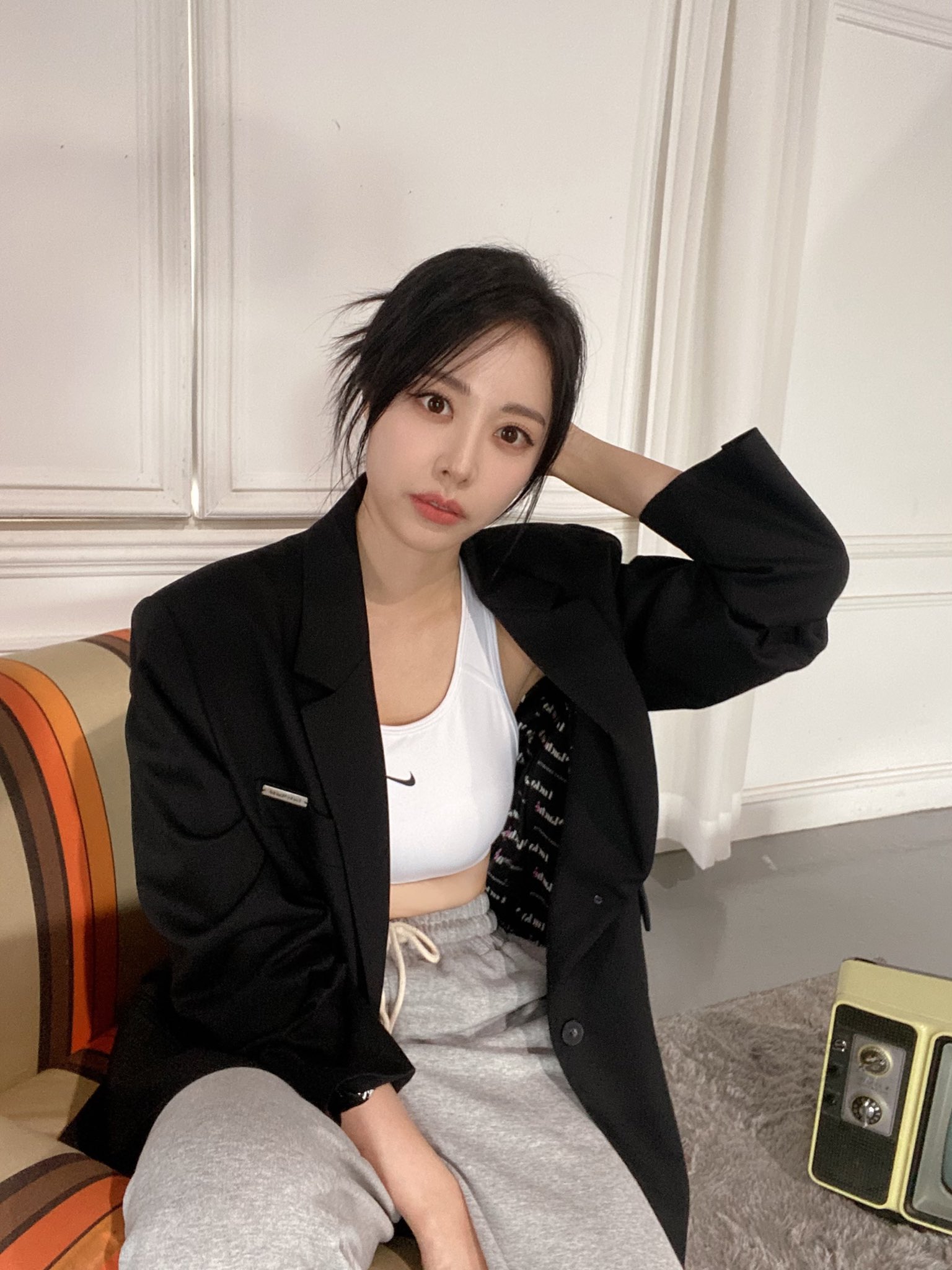 흰색 브라탑에 회색의 추리닝 바지를 매칭하였다.