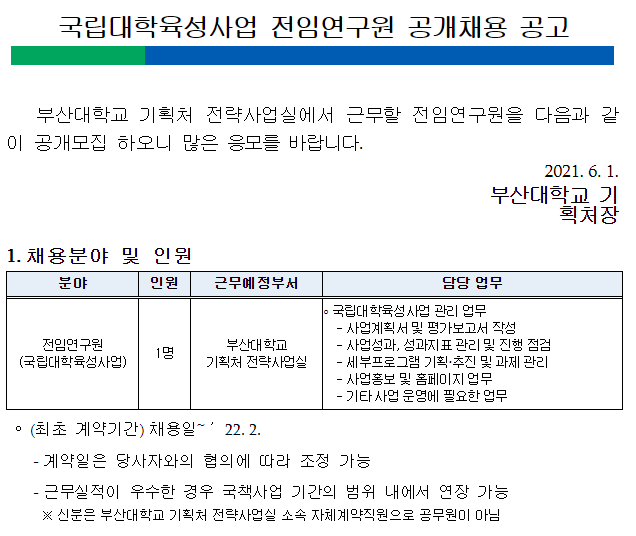 부산대학교 기획처 전략사업실에서는 국립대학육성사업 전임연구원을 아래와 같이 공개모집 합니다. 많은 응모를 바랍니다. 1. 채용분야 : 국립대학육성사업 전임연구원 2. 담당업무 : 국립대