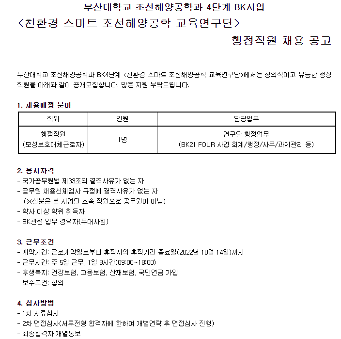 부산대학교 친환경 스마트 조선해양공학 교육연구단 행정직원(모성보호 대체근로자) 채용공고