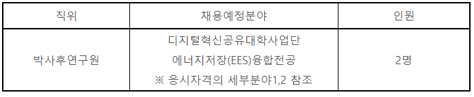 | 박사후연구원 | 디지털혁신공유대학사업단 에너지저장(EES)융합전공 ※ 응시자격의 세부분야1,2 참조 |