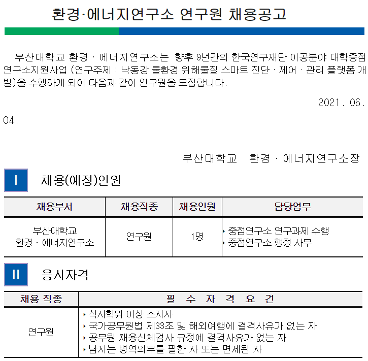 부산대학교 환경·에너지연구소는 향후 9년간의 한국연구재단 이공분야 대학중점연구소지원사업 (연구주제 : 낙동강 물환경 위해물질 스마트 진단·제어·관리 플랫폼 개발)을 수행하게 되어 다음과 같이 연구원을 모집합니다.