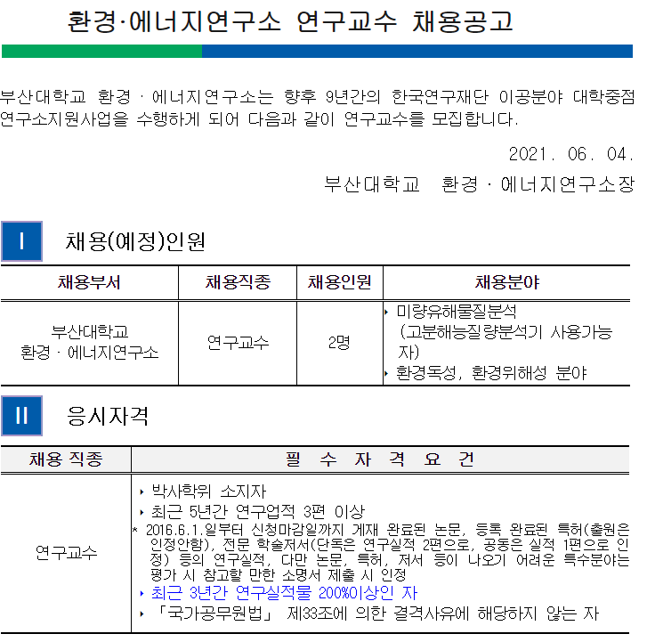 부산대학교 환경·에너지연구소는 향후 9년간의 한국연구재단 이공분야 대학중점연구소지원사업을 수행하게 되어 연구교수와 연구원을 모집합니다.