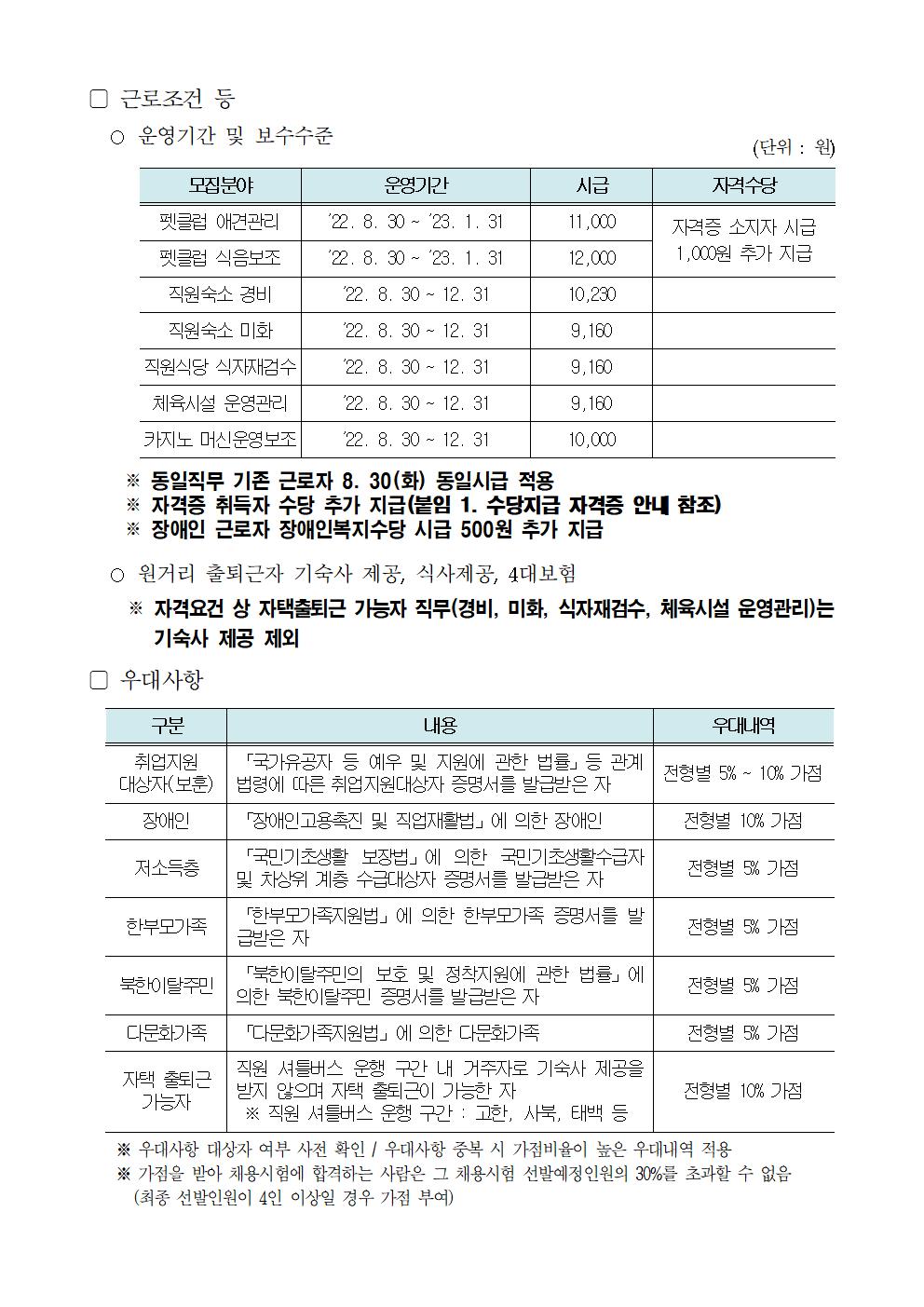 단, 자격요건 상 자택출퇴근 가능자 직무(경비, 미화, 식자재검수, 체육시설 운영관리)는 기숙사 제공 제외