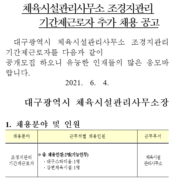 대구광역시 체육시설관리사무소 조경지관리 기간제근로자를 다음과 같이 공개모집 하오니 유능한 인재들의 많은 응모바랍니다.