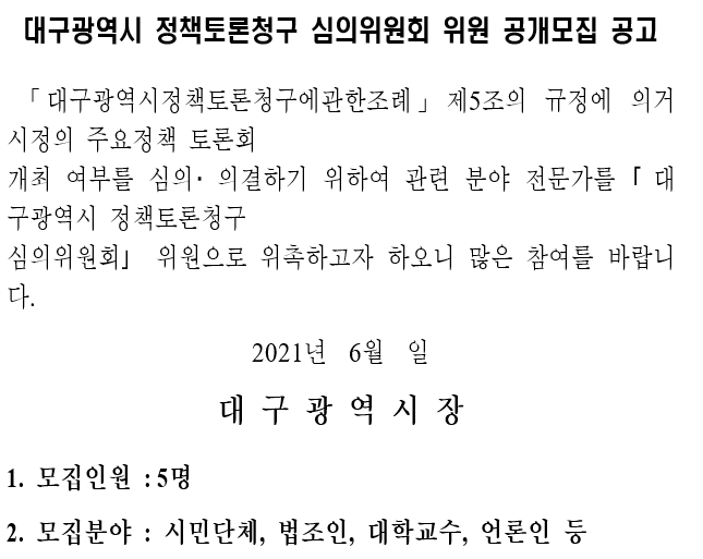 심의・의결하기 위하여 관련 분야 전문가를 「대구광역시 정책토론청구 심의위원회」 위원으로