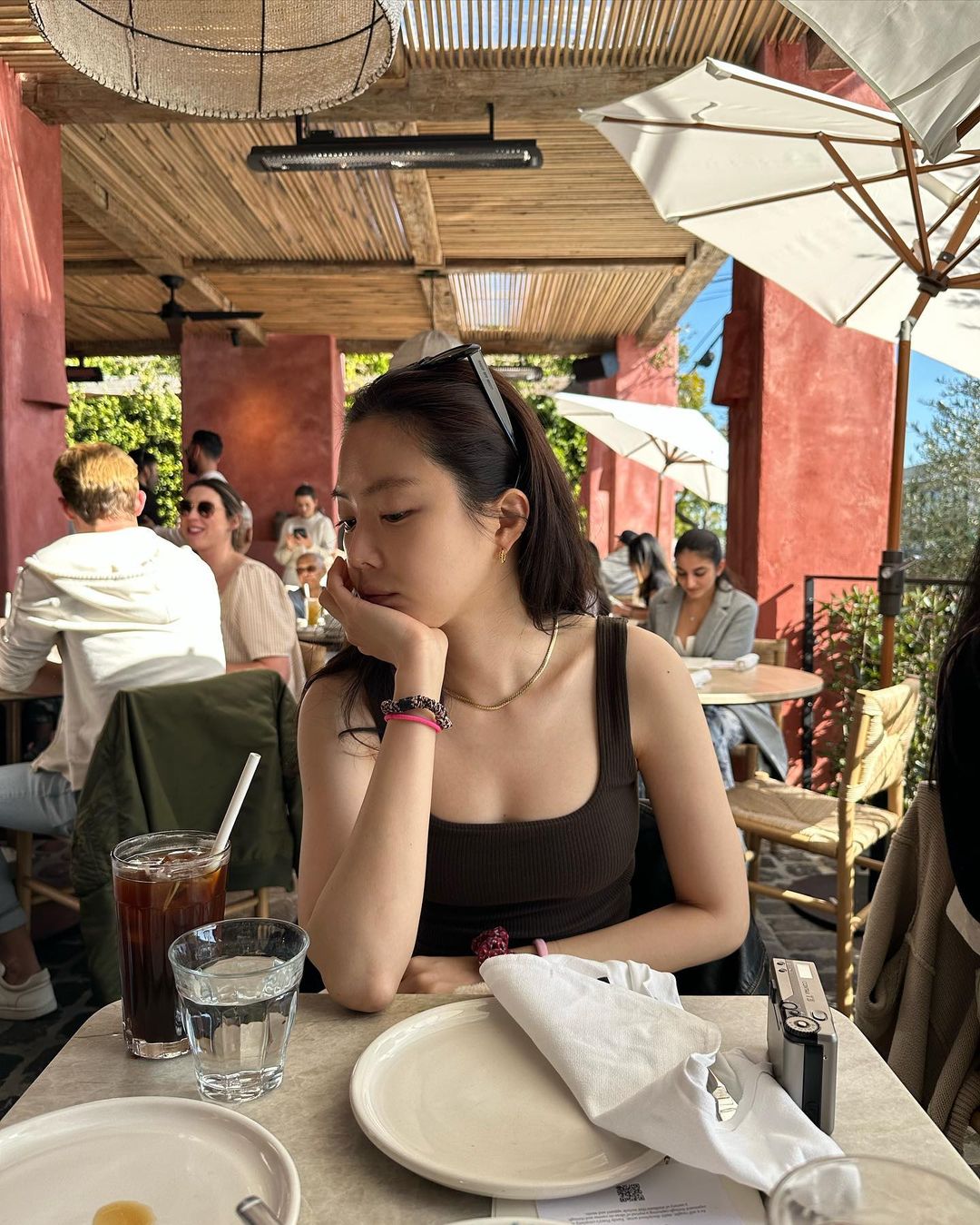 손나은이 해외여행 중 남긴 나시티와 검은 타이트한 바지의 조합 패션.