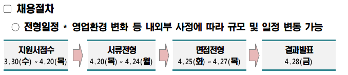 서류전형 합격발표 | 4.49(월), 오후 18시 이후 | 합격자/불합격자 개별 문자 안내 |