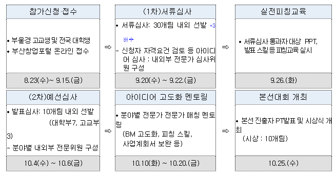 서류심사를 통해 1차로 예선 대회 참가 30개 팀을 선정한 다음, 실전 피칭(아이디어 소개 발표) 교육을 진행하고, 예선심사를 통해 본선 대회 참가 10개 팀을 선정한다. 이후 아이디어 고도화, 최종 점검 지도(멘토링) 프로그램을 거쳐 오는 10월 25일 본선 대회에서 최종 수상자를 정한다.
