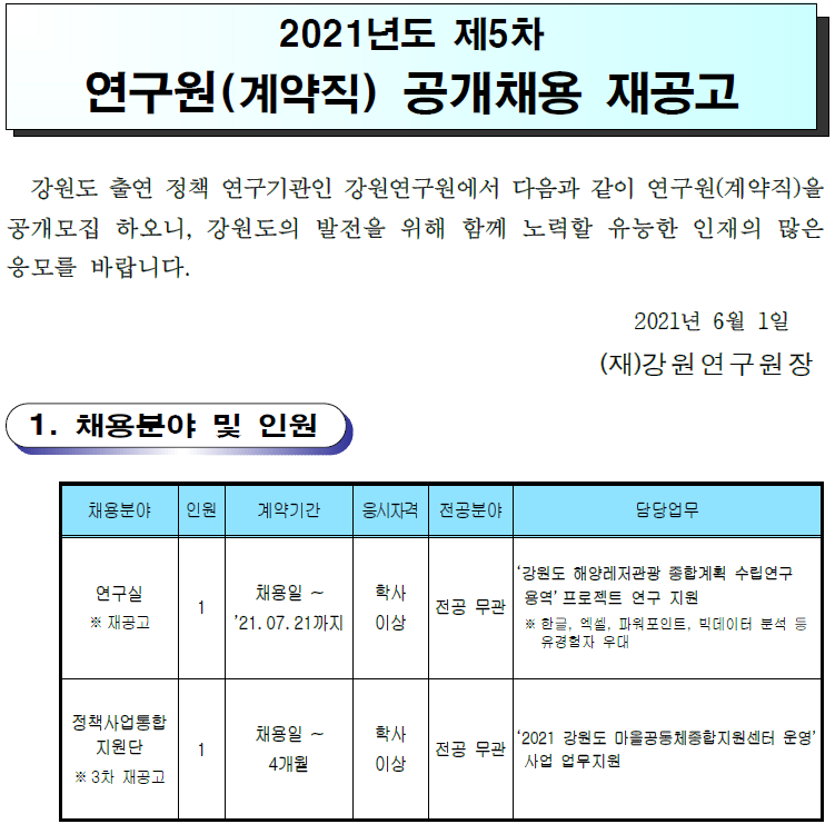 출처 - 채용정보 - 2021년도 제5차 연구원(계약직) 공개채용 재공고 읽기 | 강원도청 > 도정마당 (provin.gangwon.kr)